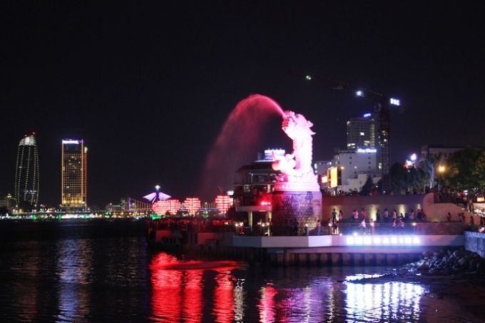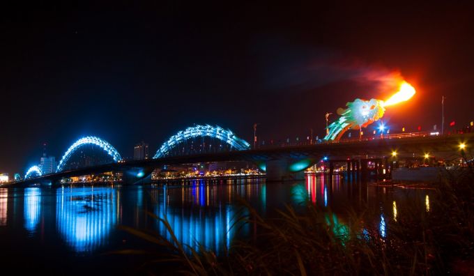 Cầu Rồng luôn được xem là biểu tượng của Đà Nẵng, chiếc cầu được thiết kế độc đáo, với đầu rồng thời Lý, phần thân uốn lượn mềm mại, phần đuôi là hình những cánh sen được cách điệu. Khi tới Đà Nẵng chắc hẳn bạn sẽ chọn cầu rồng để ghé chơi đầu tiên, cầu Rồng có chương trình phun nước, phun lửa vào các tối thứ 7 và chủ nhật lúc 21 giờ.Nếu bạn muốn tận hưởng những khoảnh khắc lạ kỳ đó hãy đến sớm hơn khoảng 20 phút và chọn cho mình một view nhìn thật đẹp.