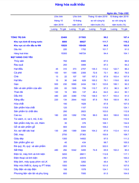 Trong 10 tháng của năm 2019, tổng trị giá xuất khẩu hàng hóa của Việt Nam ước đạt 217,05 tỷ USD, tăng 7,4% so với cùng kỳ năm ngoái. Nhiều mặt hàng chủ lực tiếp tục tăng trưởng khá ấn tượng.