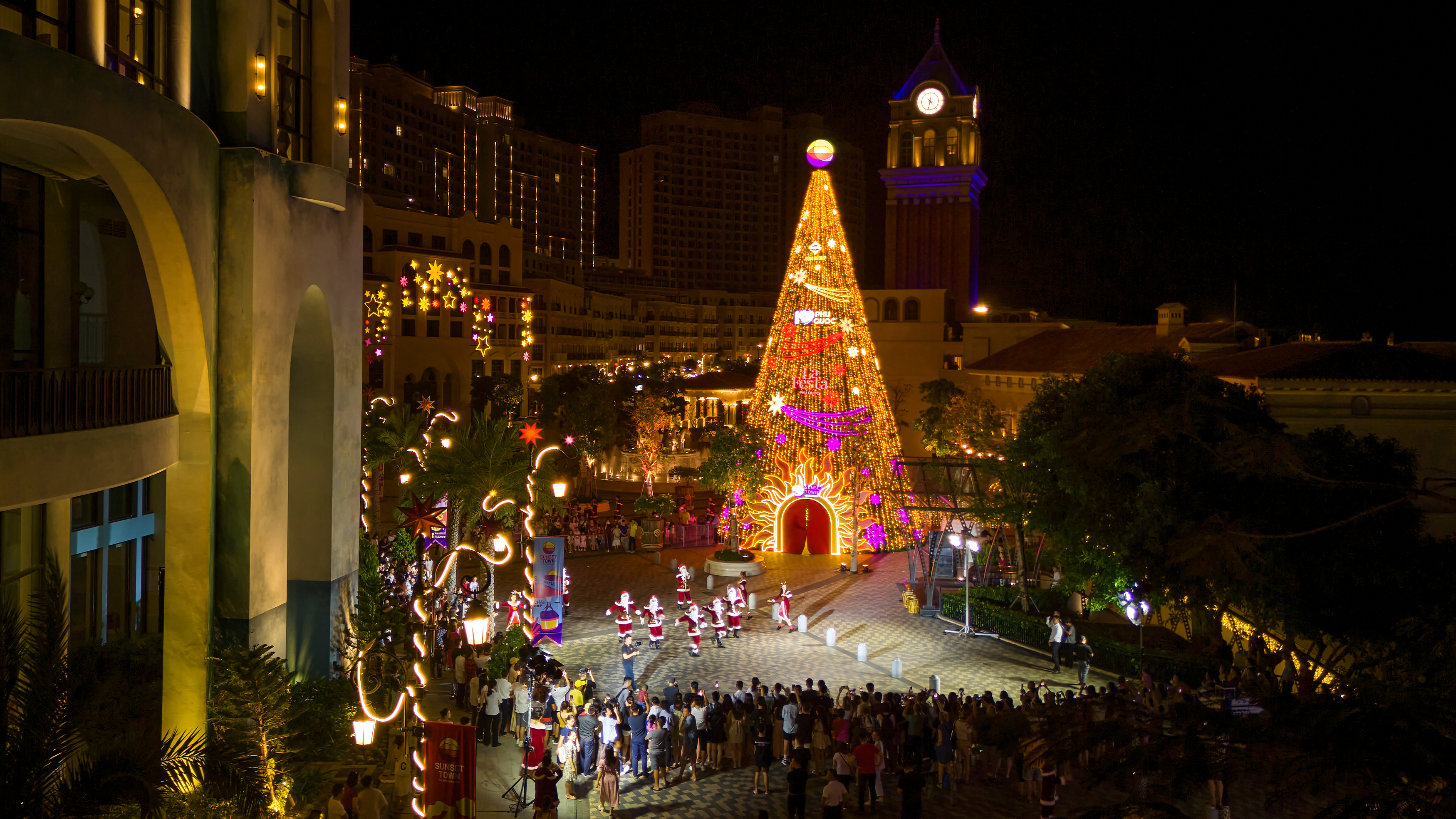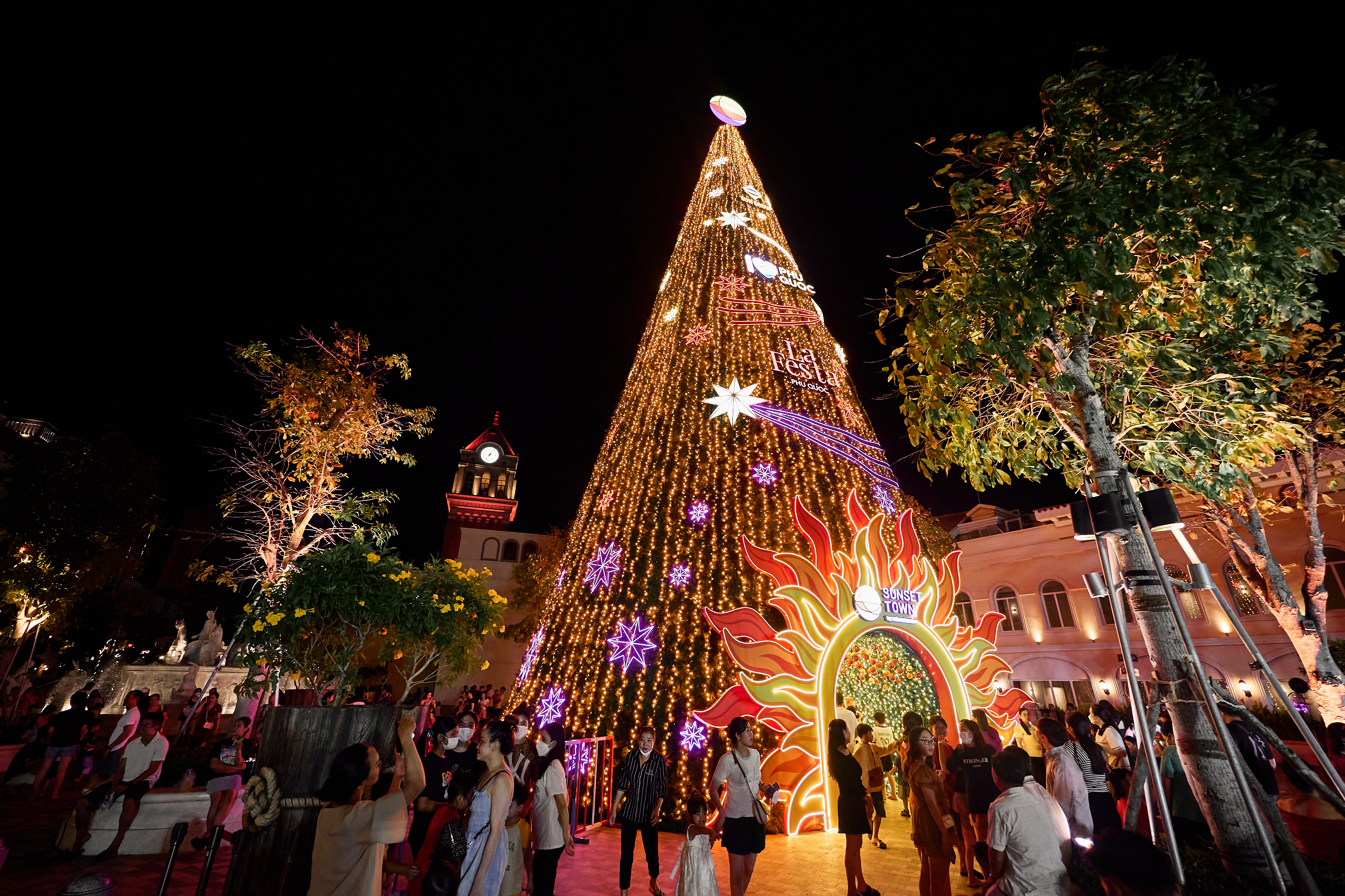 Thị trấn Hoàng Hôn Sunset Town, Phú Quốc chính thức khai mạc mùa lễ hội với Lễ thắp sáng Cây thông Ngàn sao diễn ra tối 20/12 tại Quảng trường La Festa. Đông đảo du khách tham dự đã vô cùng thích thú khi được “check-in” cây thông khổng lồ ngập tràn ánh sáng.