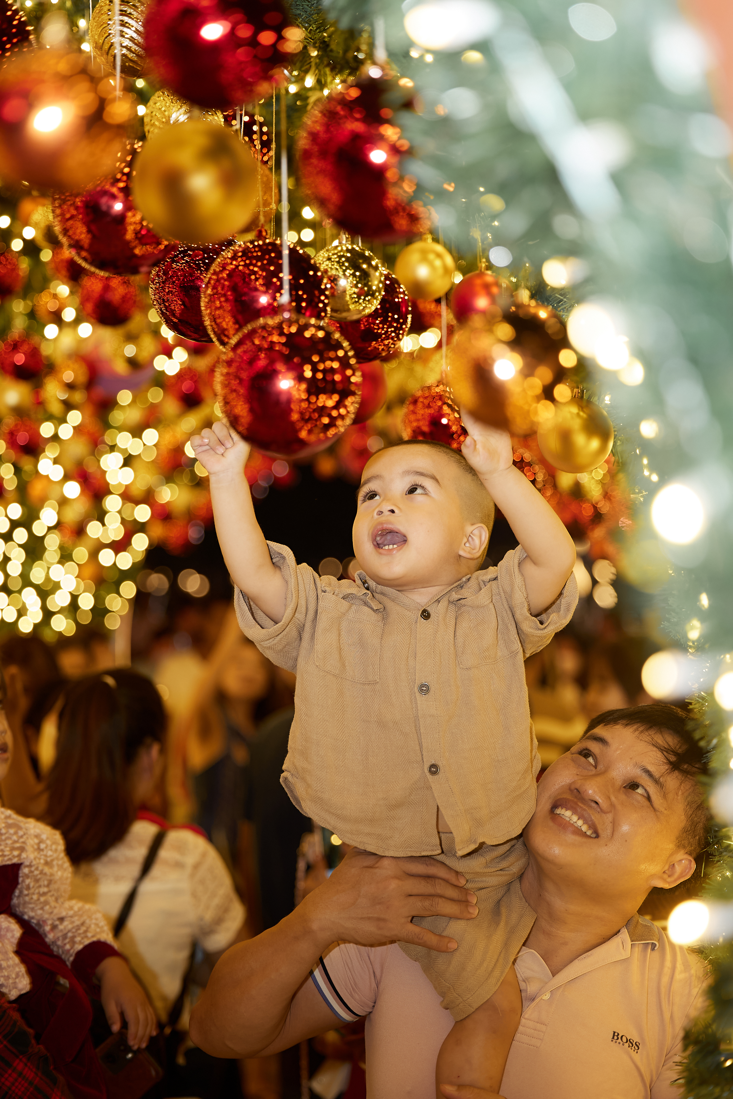 Lối hầm vào cây thông được tạo hình cổng mặt trời màu vàng cam rực rỡ, như đang tỏa ra những tia nắng để mang đến ấm áp tới mọi người. Bước qua tấm rèm nhung đỏ của khung cửa, du khách như “choáng ngợp” bởi hàng ngàn ánh đèn lấp lánh chiếu sáng với những quả châu, ngôi sao nhiều màu sắc. Hiệu ứng ánh sáng như khiến ta có cảm giác vừa bước qua một cánh cửa diệu kỳ, và được chào đón bằng những niềm vui, hạnh phúc và hy vọng tươi sáng.