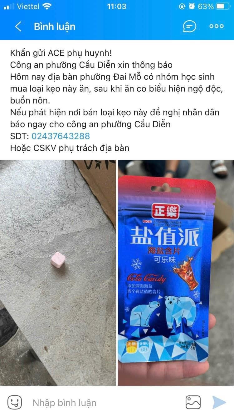 Trước đó, chiều ngày 29/11 một nhóm gồm 11 học sinh Trường THCS Nguyễn Quý Đức, quận Nam Từ Liêm (Hà Nội) mua một loại kẹo không rõ nguồn gốc, bao bì in chữ nước ngoài và chia nhau ăn. Sau đó, các học sinh này có dấu hiệu đau đầu, buồn nôn và được chuyển xuống phòng y tế của nhà trường. Đây là những học sinh không ăn bán trú, không ngủ trưa ở trường.