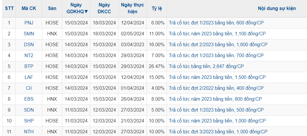 11doanh nghiệp trả cổ tức bằng tiền mặt tuần 11/3-15/3