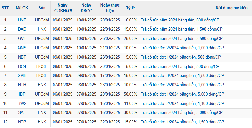 Theo thống kê trong tuần từ 6/1 đến 10/1, thị trường chứng khoán có 12 doanh nghiệp chốt ngày giao dịch không hưởng quyền để nhận cổ tức tiền mặt, mức cao nhất là 25% và thấp nhất là 5%.