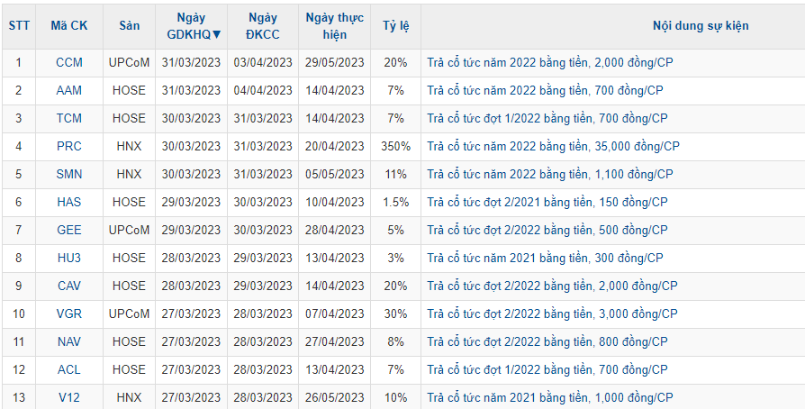 CTCP Khoáng sản & Xi măng Cần Thơ (mã chứng khoán CCM) chốt quyền trả cổ tức bằng tiền năm với tỷ lệ 20% (một cổ phiếu được nhận 2.000 đồng). Ngày giao dịch không hưởng quyền 31/3. Ngày đăng ký cuối cùng: 3/4. Ngày thực hiện thanh toán: 29/5.