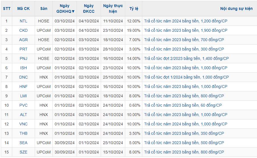 Tuần từ 30/9-4/10, trên thị trường chứng khoán Việt Nam có 15 doanh nghiệp chốt quyền nhận cổ tức bằng tiền mặt. Trong số đó doanh nghiệp trả cổ tức tỷ lệ cao như CTCP Cơ khí Đông Anh Licogi (Mã: CKD) trả tỷ lệ 19%.