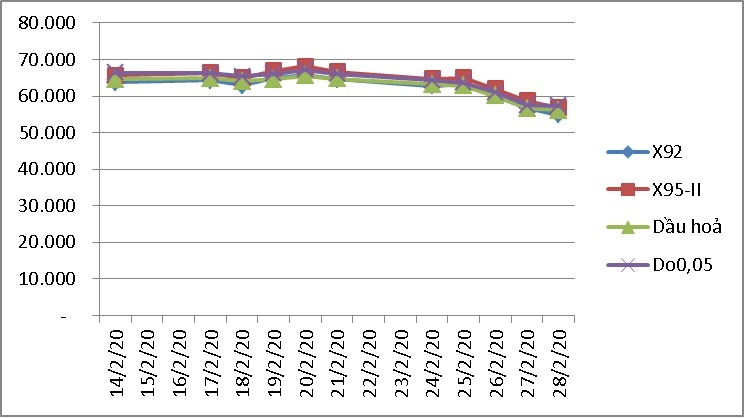Bình quân giá thành phẩm xăng dầu thế giới trong 15 ngày trước kỳ điều hành giá xăng dầu ngày 29/02/2020 có biến động tăng giảm đan xen nhưng xu hướng chung là giảm (như biểu đồ dưới), cụ thể: 62,223 USD/thùng xăng RON92 dùng để pha chế xăng E5RON92 (giảm 0,910 USD/thùng, tương đương -1,44% so với kỳ trước); 64,185 USD/thùng xăng RON95 (giảm 0,765 USD/thùng, tương đương -1,18% so với kỳ trước); 63,752 USD/thùng dầu diesel 0.05S (giảm 2,464 USD/thùng, tương đương -3,72% so với kỳ trước); 62,488 USD/thùng dầu hỏa (giảm 1,767 USD/thùng, tương đương -2,75% so với kỳ trước); 302,458 USD/tấn dầu mazut 180CST 3.5S (giảm 11,93 USD/tấn, tương đương -4,12% so với kỳ trước).