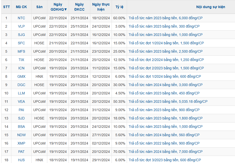 Theo thống kê trong tuần 18/11– 22/11, 18 doanh nghiệp trả cổ tức bằng tiền mặt với mức cao nhất là 70% và thấp nhất là 3%. Ngoài ra, còn 1 doanh nghiệp trả cổ tức bằng cổ phiếu.