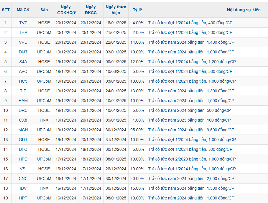 Theo thống kê, trong tuần 16/12– 20/12 có 20 doanh nghiệp thông báo chốt quyền cổ tức bằng tiền mặt với mức cao nhất là 95% và thấp nhất là 1%.