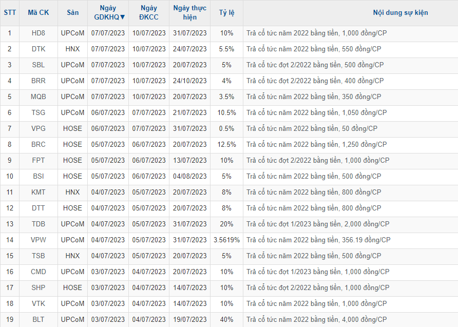Theo thống kê, có 19 doanh nghiệp thông báo chốt quyền cổ tức bằng tiền mặt trong tuần 3/7 – 7/7. Trong số các doanh nghiệp chia cổ tức tiền mặt tuần này, cao nhất là 40% và thấp nhất là 0,5%.