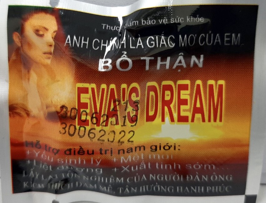 Thực phẩm bảo vệ sức khỏe Bổ thận EVA’S DREAM (213; 30062019; 30062022); nhà sản xuất Công Ty TNHH Sản Xuất Và Thương Mại Đại Phúc Nhân có chứa chất cấm Sildenafil, Sildenafil N-oxide; Tadanafil (LOD: 0,4mg/kg).