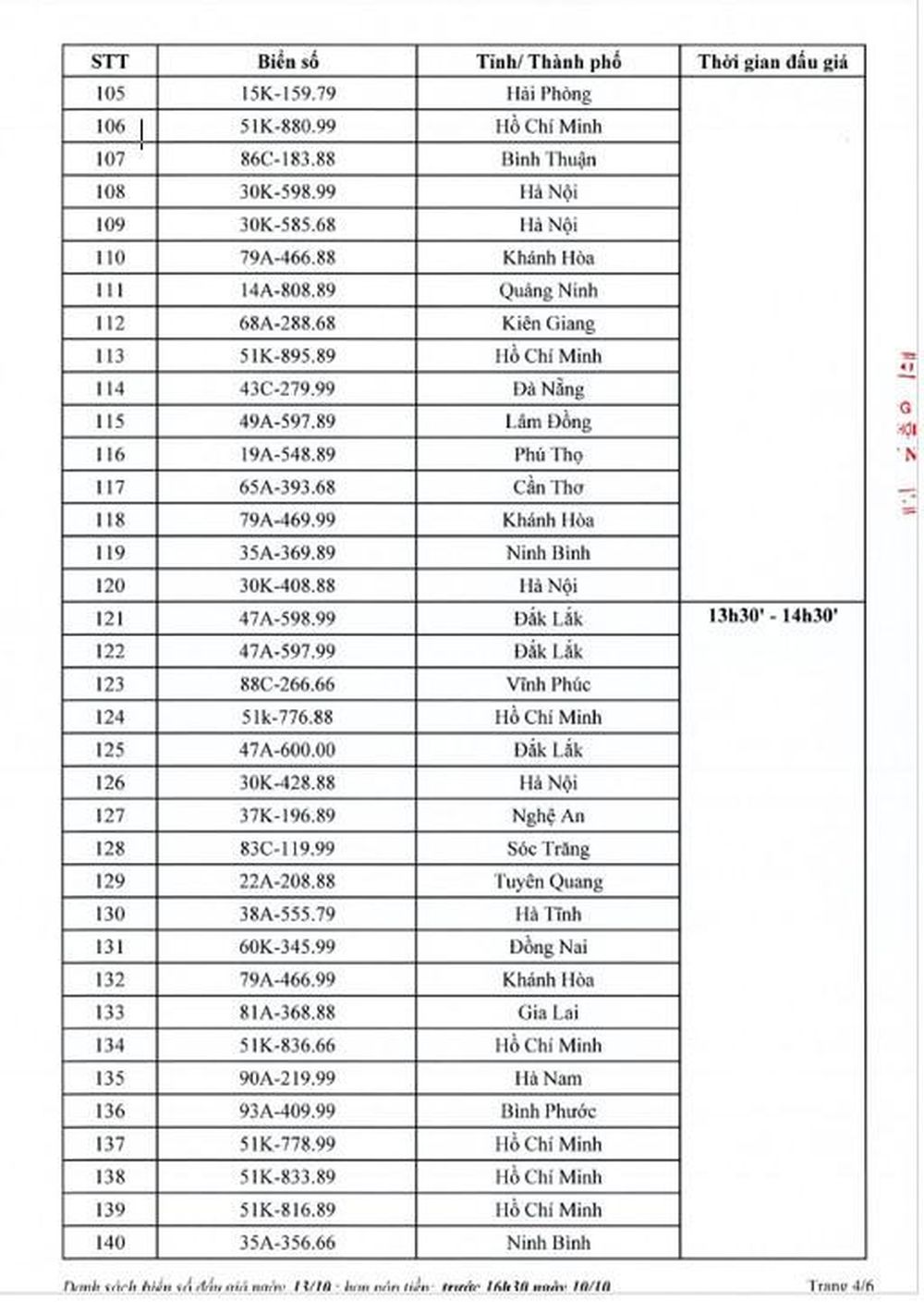 Dưới đây là danh sách biển số ô tô và các phiên đấu giá trực tuyến ngày 13/10:
