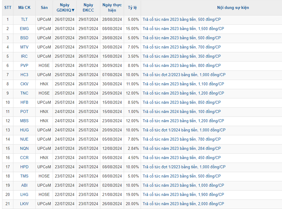 Theo thống kê, có 21 doanh nghiệp thông báo chốt quyền cổ tức bằng tiền mặt trong tuần 22/7– 26/7, mức cao nhất là 20% và thấp nhất là 1%.