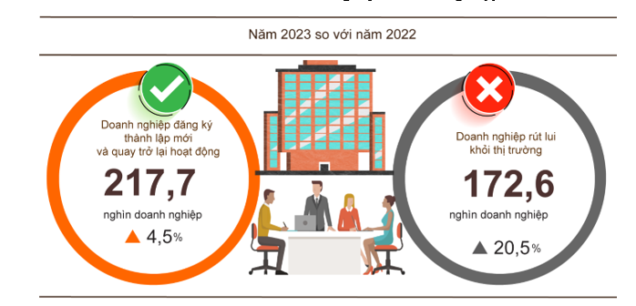 Bên cạnh đó, còn có 58,4 nghìn doanh nghiệp quay trở lại hoạt động, giảm 2,4% so với năm 2022, nâng tổng số doanh nghiệp thành lập mới và doanh nghiệp quay trở lại hoạt động trong năm 2023 lên 217,7 nghìn doanh nghiệp, tăng 4,5% so với năm 2022. Bình quân một tháng có 18,1 nghìn doanh nghiệp thành lập mới và quay trở lại hoạt động.