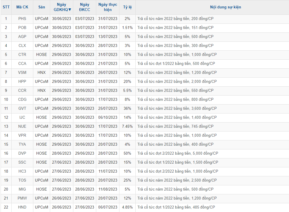 Theo thống kê tuần từ 26- 30/6/2023, có 22 doanh nghiệp thông báo chốt quyền trả cổ tức bằng tiền mặt, mức trả cao nhất là 50% và thấp nhất là 1,5%.