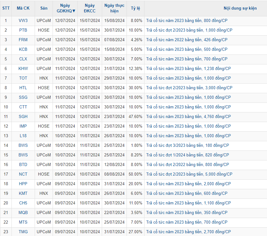 Theo thống kê, có 23 doanh nghiệp thông báo chốt quyền cổ tức tiền mặt trong tuần 8/7– 12/7 với mức cao nhất là 50% và thấp nhất là 3,5%.