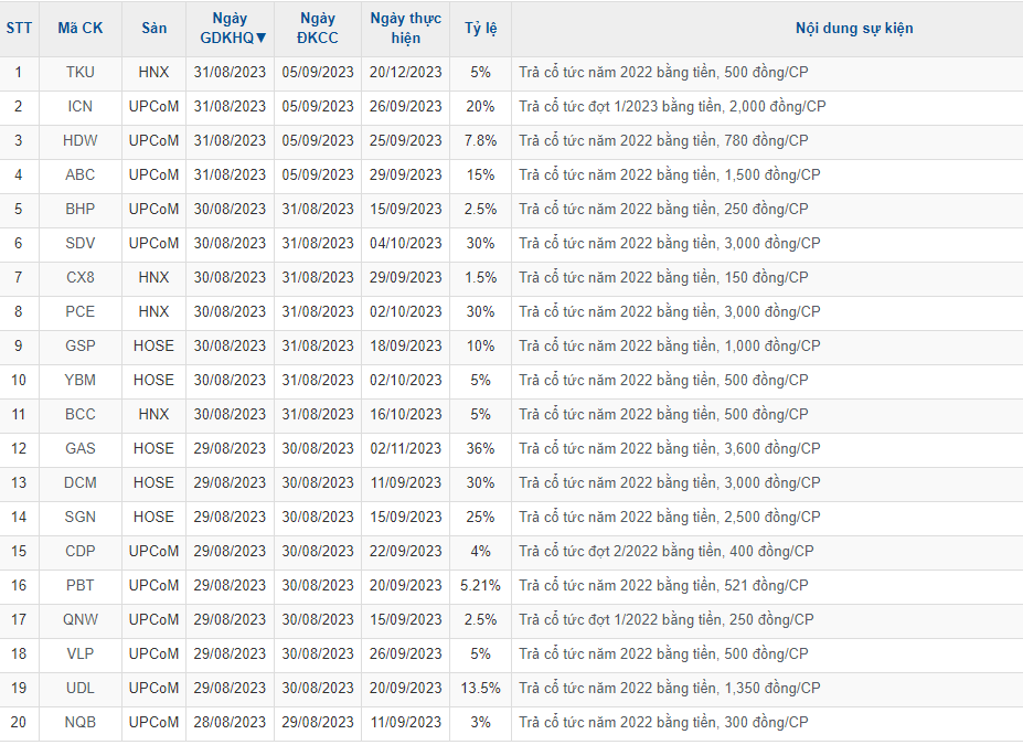 Tuần từ 28/8- 1/9/2023, trên thị trường chứng khoán Việt Nam có 24 doanh nghiệp chốt quyền nhận cổ tức bằng tiền mặt. Trong số đó doanh nghiệp trả cổ tức tỷ lệ cao như Tổng Công ty Khí Việt Nam - CTCP (HOSE: GAS) trả tỷ lệ 36%.