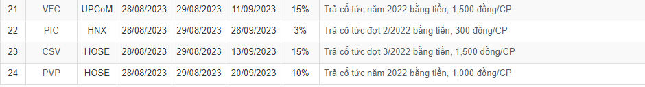 Theo thống kê, có 24 doanh nghiệp thông báo chốt quyền cổ tức bằng tiền mặt trong tuần 28/8- 1/9. Chỉ có 4 doanh nghiệp chia cổ tức tiền mặt với tỷ lệ trên 30%, cao nhất là 36%.