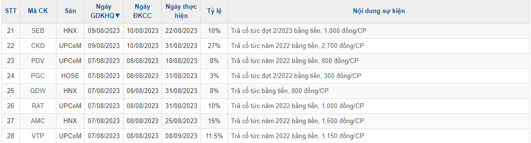 CTCP Đầu tư và Phát triển Điện miền trung (HNX: SEB) trả cổ tức đợt 2/2023 bằng tiền, 1.000 đồng/cp. Ngày giao dịch không hưởng quyền là 9/8 và ngày đăng ký cuối cùng là 10/8.