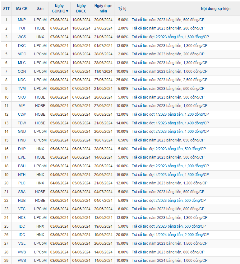 Tuần từ 3/6 - 7/6 , trên thị trường chứng khoán Việt Nam có 29 doanh nghiệp chốt quyền nhận cổ tức bằng tiền mặt. Trong số đó doanh nghiệp trả cổ tức tỷ lệ cao như CTCP Nam Dược (mã chứng khoán NDC) với tỷ lệ 25%.