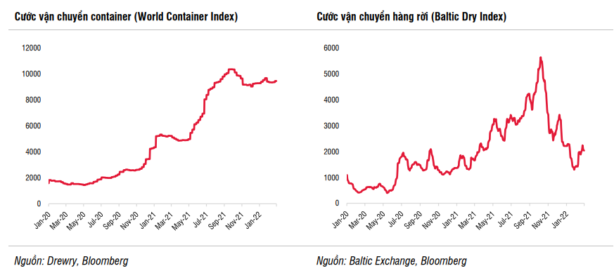 SSI Research chưa thấy có dấu hiệu cải thiện nào đối với tình trạng gián đoạn chuỗi cung ứng toàn cầu trong thời gian tới. Do đó, giá cước vận tải container (quan sát qua World Container Index) điều chỉnh nhẹ so với mức cao nhất từ tháng 10/2021 và vẫn ổn định ở mức cao. Điều này trái ngược với thị trường hàng rời có tính biến động cao (quan sát qua Baltic Dry Index), vốn phụ thuộc phần lớn vào việc giao thương quặng sắt, than và ngũ cốc.