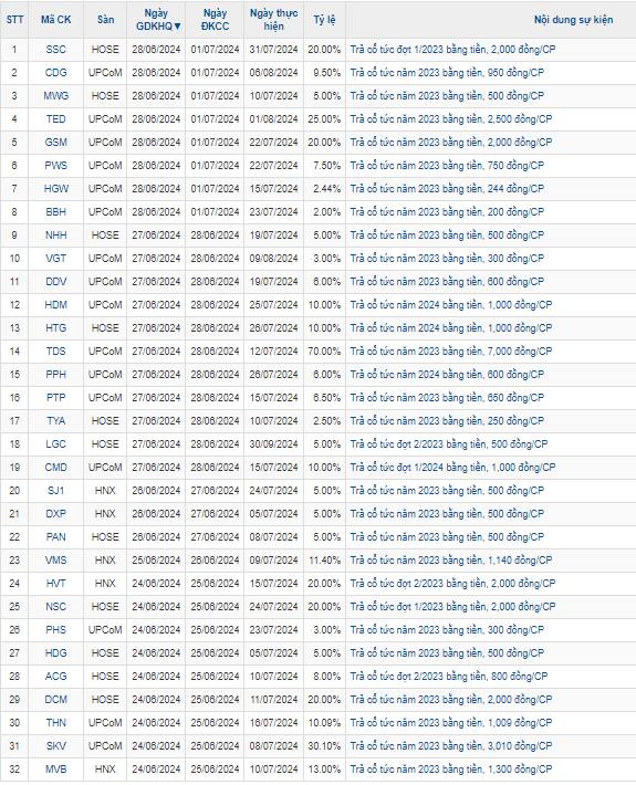 Tuần từ 24-28/6, trên thị trường chứng khoán Việt Nam có 32 doanh nghiệp chốt quyền nhận cổ tức bằng tiền mặt. Trong số đó doanh nghiệp trả cổ tức tỷ lệ cao như CTCP Thép Thủ Đức – Vnsteel (Mã: TDS) trả tỷ lệ 70%.