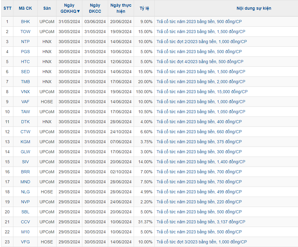 Theo thống kê trên 3 sàn HoSE, HNX và UPCoM, có 43 doanh nghiệp chốt trả cổ tức cho cổ đông, các ngày trong tuần từ 27 đến 31/5.