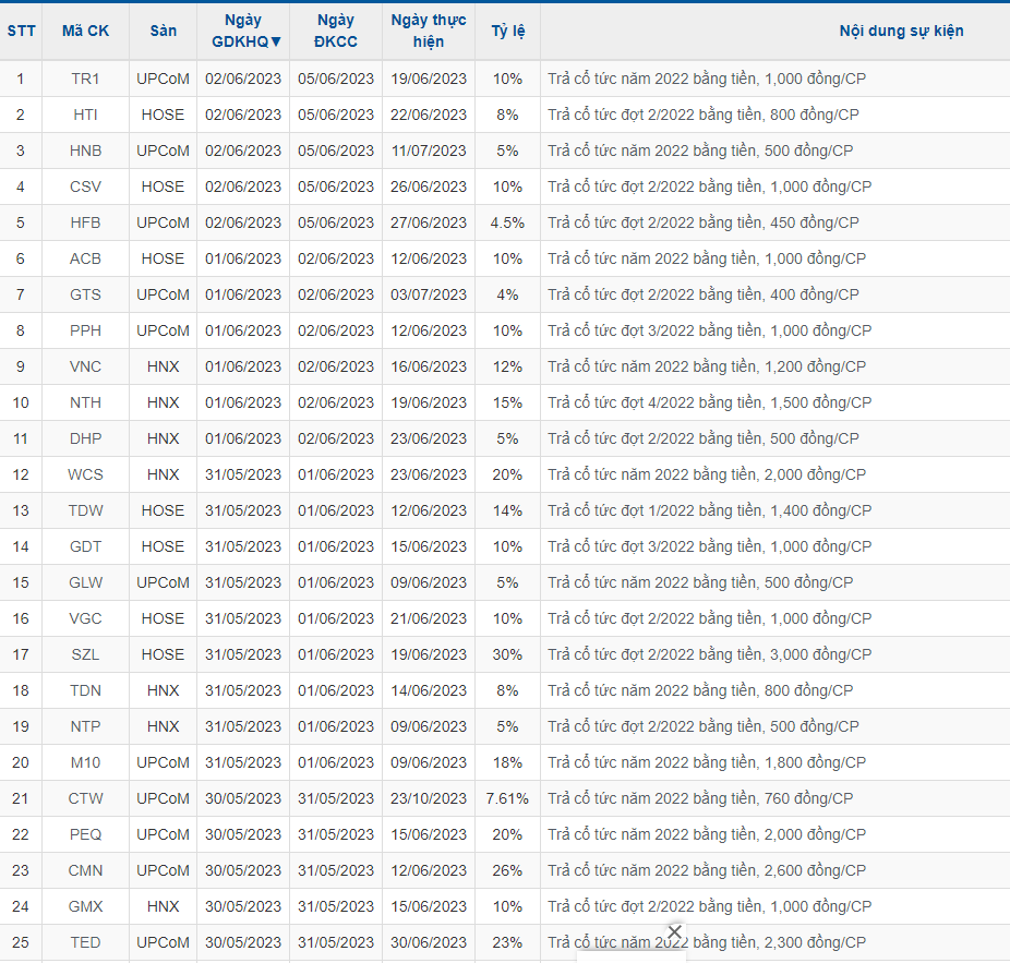 CTCP Harec Đầu tư và Thương Mại (Mã HRB): Ngày 31/5/2023 là ngày đăng ký cuối cùng để chốt danh sách nhận cổ tức bằng tiền năm 2022 tỷ lệ 25% (1 cổ phiếu được nhận 2.500 đồng). Ngày thanh toán là 19/6/2023.