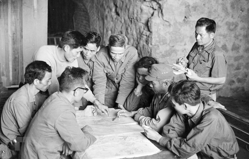 Bộ Chỉ huy mặt trận Lạng Sơn cùng chỉ huy Đoàn 327 bàn phương án tác chiến tại hang Chùa Tiên (thị xã Lạng Sơn). (Ảnh: Văn Bảo/TTXVN)