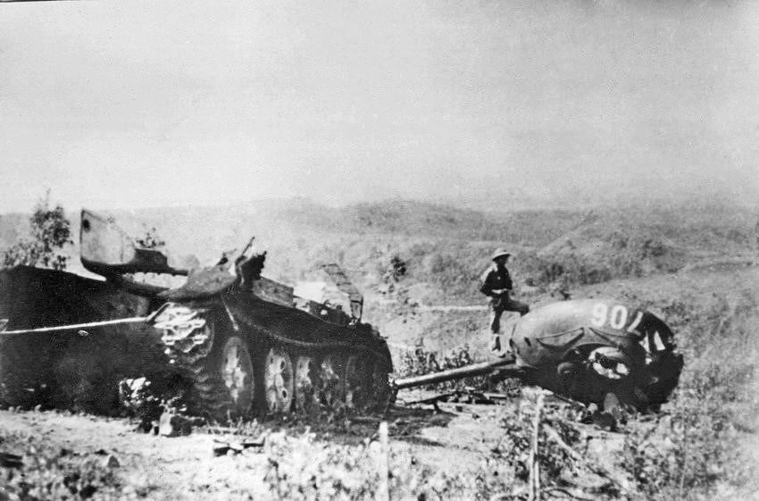 Xe tăng địch bị quân ta đánh gục ngay loạt đạn đầu tiên tại khu vực cầu Bản Sẩy, xã Bế Triều, huyện Hòa An, tỉnh Cao Bằng. (Ảnh: Trần Mạnh Thường/TTXVN phát)