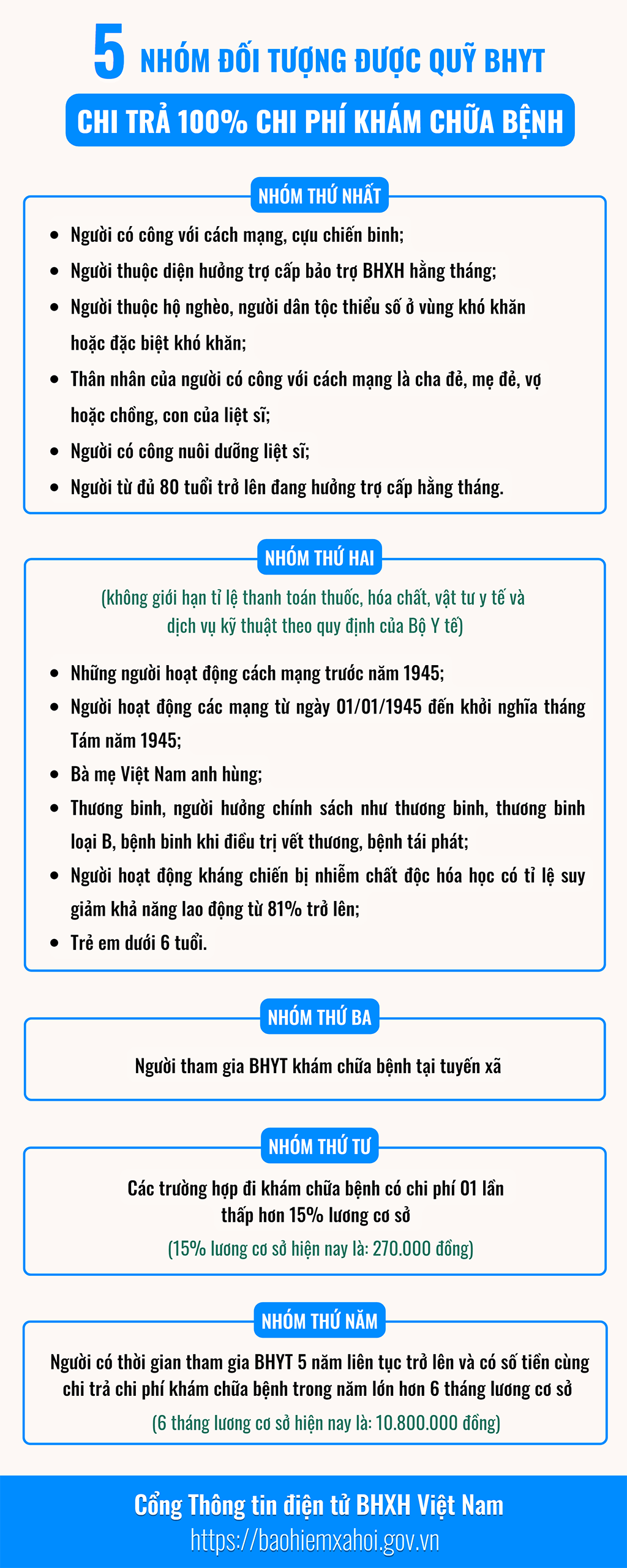 Theo BHXH Việt Nam, quy định hiện nay có một số nhóm đối tượng được quỹ BHYT chi trả 100% chi phí khi đi khám chữa bệnh tại các cơ sở y tế.