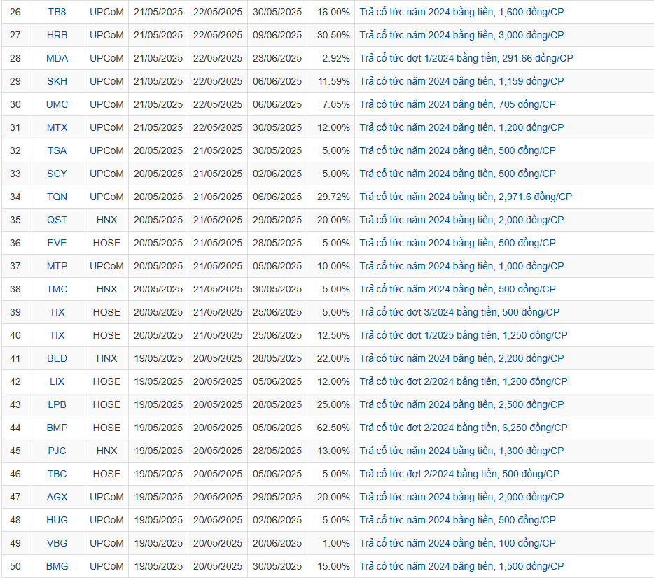 Theo thống kê, có 50 doanh nghiệp thông báo chốt quyền cổ tức bằng tiền mặt trong tuần 19/5-24/5 với mức cao nhất là 100% và thấp nhất là 1%.