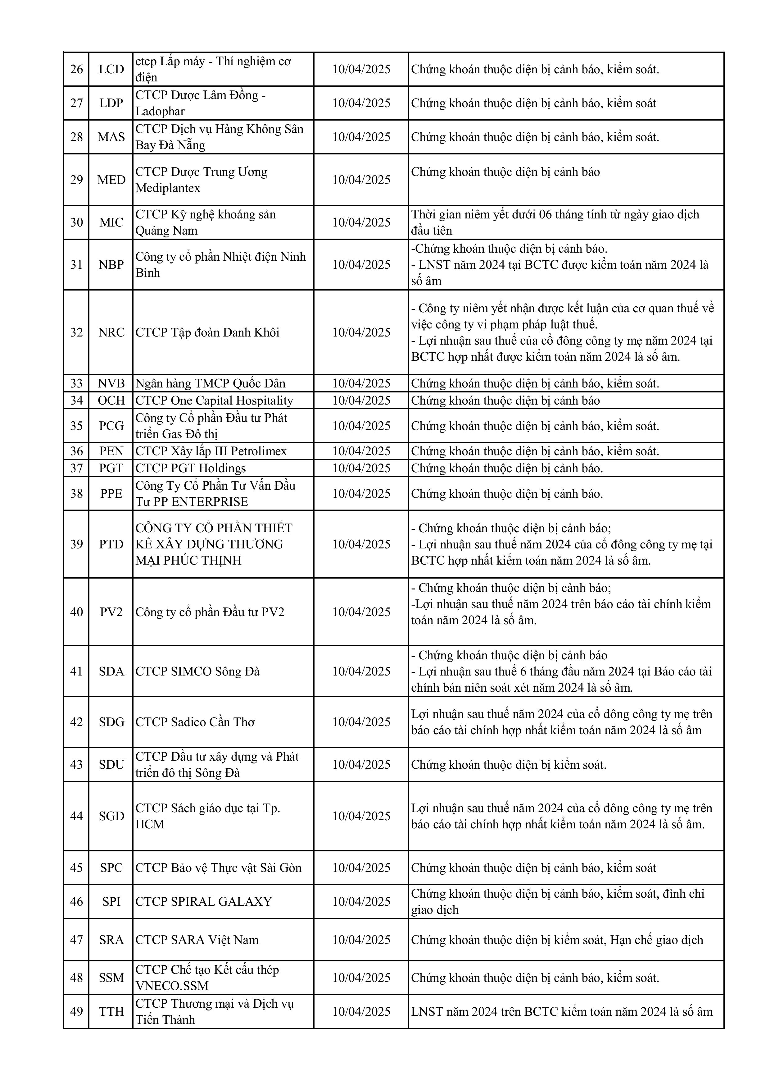 Trước đó, Sở Giao dịch Chứng khoán TP HCM (HOSE) đã công bố danh sách 67 mã chứng khoán không đủ điều kiện giao dịch ký quỹ trong quý 2/2025 với nhiều cái tên quen thuộc tiếp tục ghi danh do nằm trong diện bị cảnh báo hoặc kiểm soát như APH, ASP, BCE, C47, CRE, CIG, AGM, DLG, DRH, DXV, EVG, HAG, JVC, KPF, NVT, OGC, PIT, PMG, PSH, RDP, SMC, TVB, TTF, VAF, VNE,…