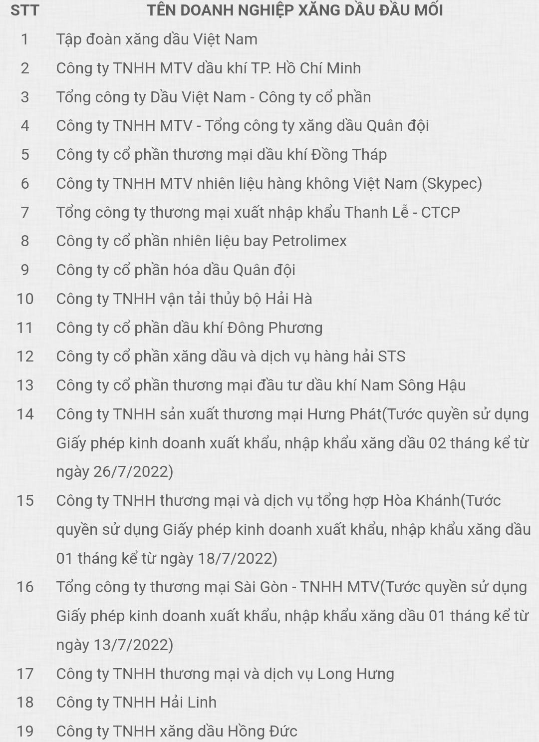 Website "Công khai minh bạch hoạt động kinh doanh điện, xăng dầu" của Bộ Công Thương đã đăng tải các doanh nghiệp đầu mối (xuất nhập khẩu). Theo đó, danh sách có tổng cộng 38 doanh nghiệp đầu mối xăng dầu, tuy nhiên chỉ có 7 doanh nghiệp bị tước giấy phép hoạt động kinh doanh từ 1 đến 2 tháng.
