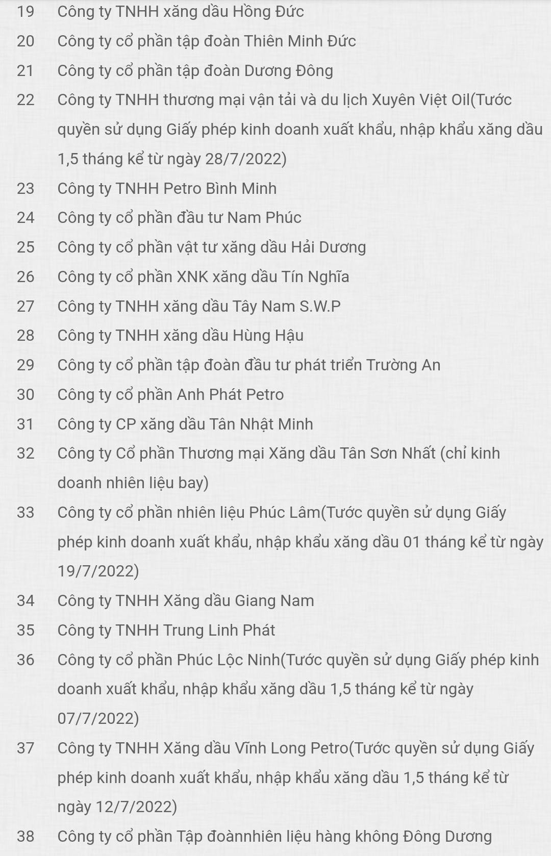 CTCP nhiên liệu Phúc Lâm (Tước quyền sử dụng Giấy phép kinh doanh xuất khẩu, nhập khẩu xăng dầu 1 tháng kể từ ngày 19/7/2022); CTCP Phúc Lộc Ninh (Tước quyền sử dụng Giấy phép kinh doanh xuất khẩu, nhập khẩu xăng dầu 1,5 tháng kể từ ngày 7/7/2022); Và Công ty TNHH Xăng dầu Vĩnh Long Petro (tước quyền sử dụng Giấy phép kinh doanh xuất khẩu, nhập khẩu xăng dầu 1,5 tháng kể từ ngày 12/7/2022).