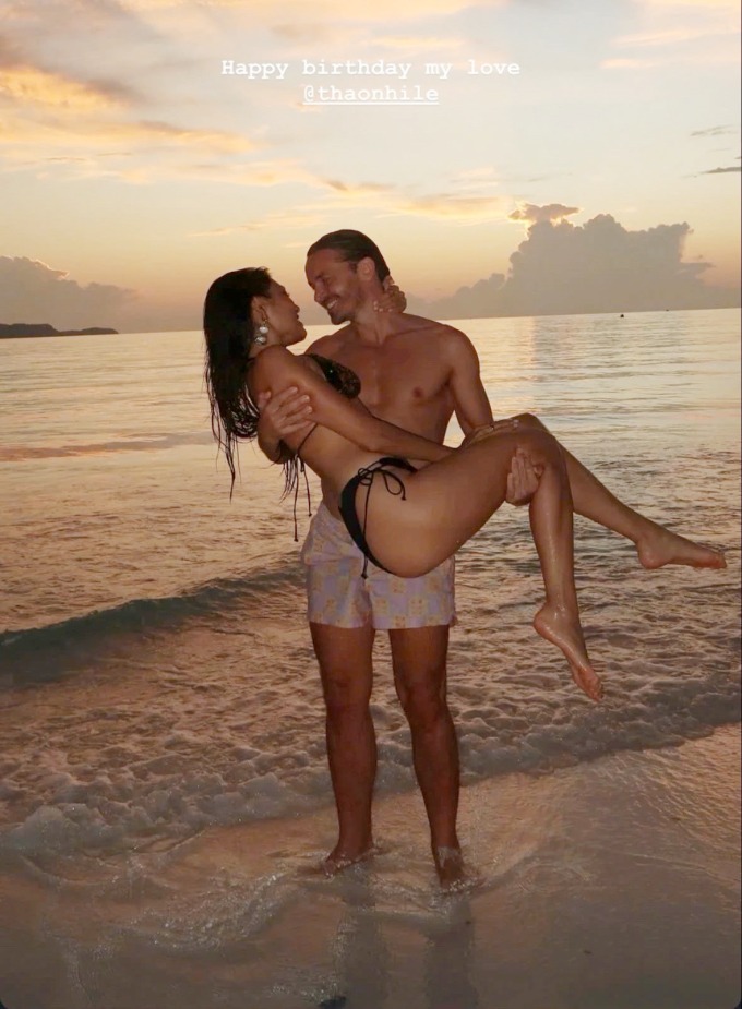 Trên trang cá nhân, Romain Leclef cũng đăng tải khoảnh khắc cực "cháy" bên bạn gái giữa khung cảnh hoàng hôn trên bãi biển để chúc mừng sinh nhật cô. Anh viết: "Chúc mừng sinh nhật tình yêu của anh". Á hậu còn chia sẻ lại story này trên trang cá nhân.