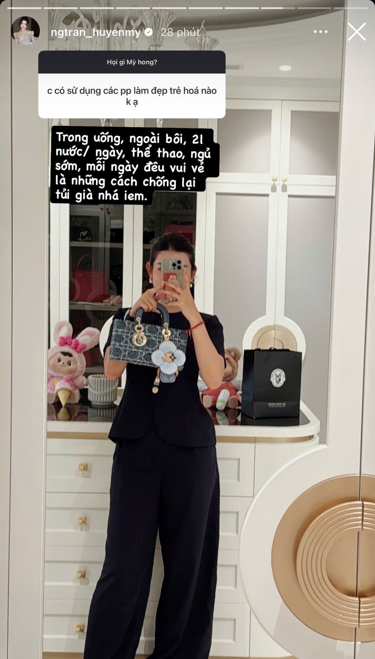 "Trong uống, ngoài bôi, 2l nước/ ngày, thể thao, ngủ sớm, mỗi ngày đều vui vẻ là những cách chống lại tuổi giá nhé em", nàng hậu tâm sự.