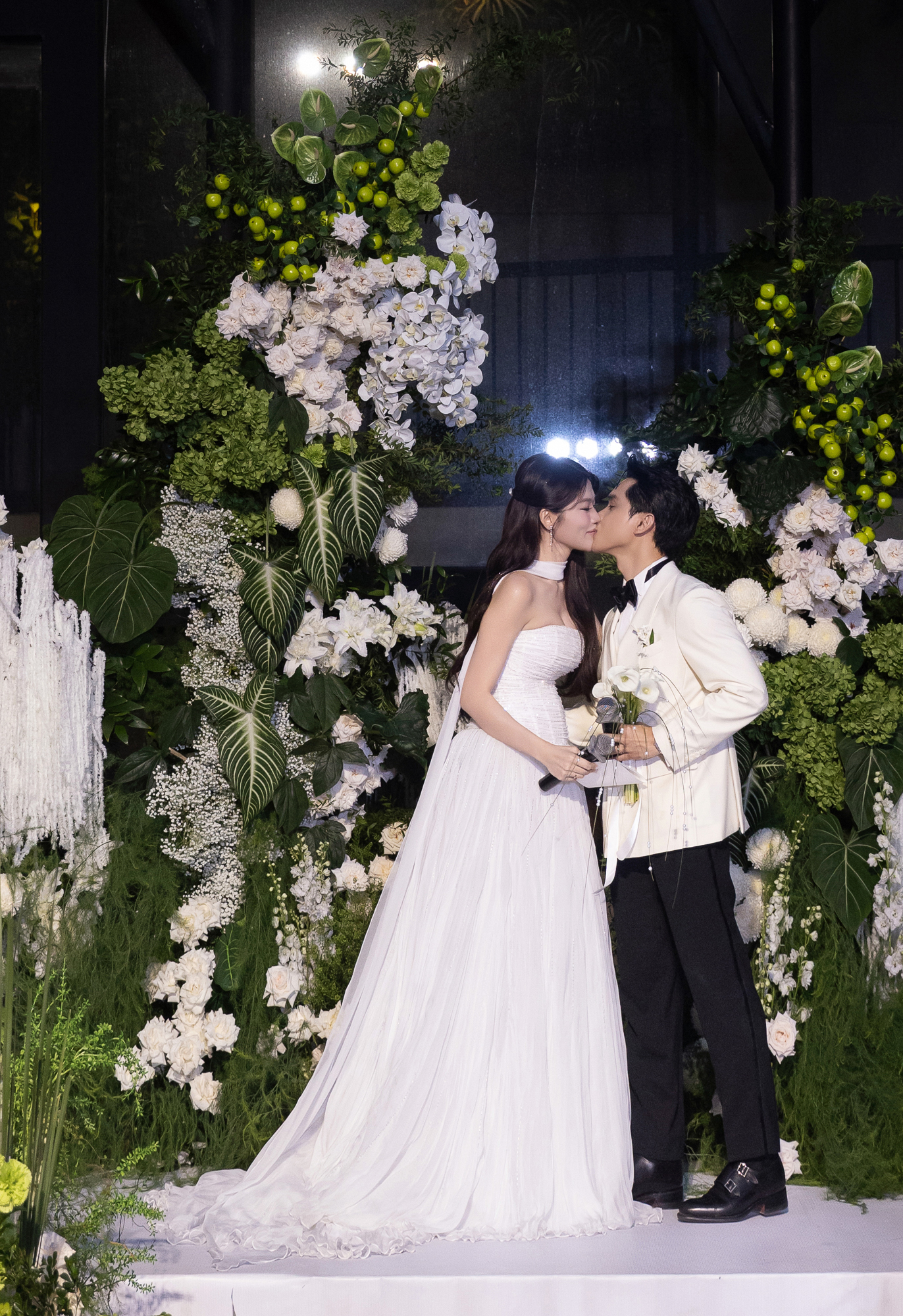 Xuất hiện trong ngày trọng đại, cô dâu diện đầm cưới phom dáng cúp ngực. Quỳnh Châu lựa chọn kiểu tóc đơn giản và lớp trang điểm nền nã vẫn khoe visual sáng rực rỡ. Trong khi đó, chú rể Ngọc Phát diện vest trắng phối cùng quần âu bảnh bao.