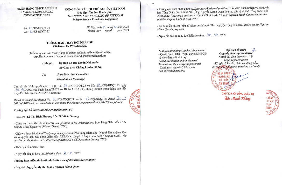 Cụ thể, đầu năm 2023, Hội đồng Quản trị Ngân hàng TMCP An Bình đã có quyết định cử bà Lê Thị Bích Phượng - Phó Tổng Giám đốc đảm nhận nhiệm vụ và quyền hạn của Tổng giám đốc ABBank thay ông Nguyễn Mạnh Quân kể từ ngày 30/01/2023.