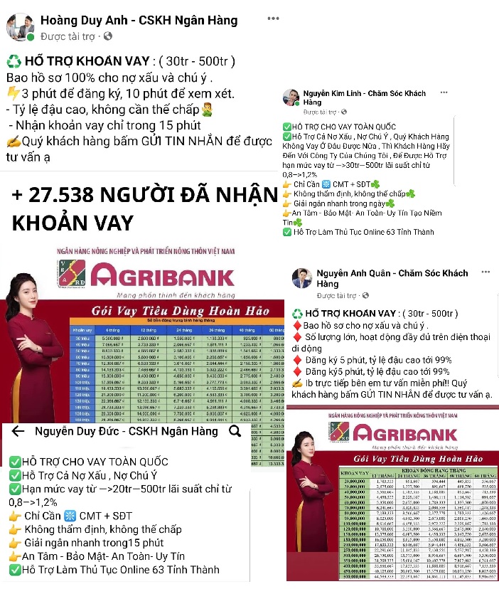 Cụ thể, gần đây trên mạng xã hội nhiều tài khoản mời gọi cho vay tín dụng, vay tiêu dùng có sử dụng tên và hình ảnh Ngân hàng Nông nghiệp và Phát triển Nông thôn Việt Nam – Agribank để tiếp cận mục tiêu với lời “chào hàng” như: