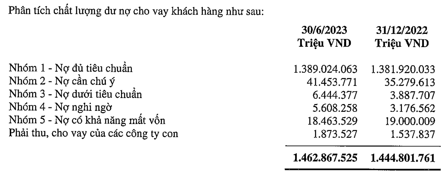 Trong đó, nợ dưới tiêu chuẩn (nhóm 3) tăng mạnh gần 66% so với đầu năm, lên mức 6.444 tỷ đồng. Nợ nghi ngờ (nhóm 4) cũng tăng 77% sau nửa năm lên mức 5.608 tỷ đồng. Nợ có khả năng mất vốn (nhóm 5) dù giảm nhẹ so với đầu năm nhưng vẫn ở mức cao gần 18.500 tỷ đồng, chiếm gần 61% tổng nợ xấu của ngân hàng.