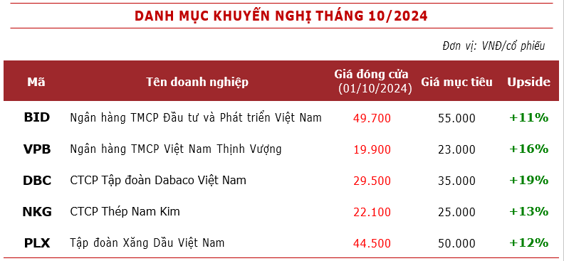 Công ty Chứng khoán Agribank (Agriseco Research) công bố danh mục khuyến nghị đầu tư trong tháng 10/2024 gồm những cổ phiếu tiềm năng có kết quả kinh doanh quý 3 tăng trưởng tốt, cổ phiếu doanh nghiệp đầu ngành và định giá đang ở vùng hợp lý để giải ngân.