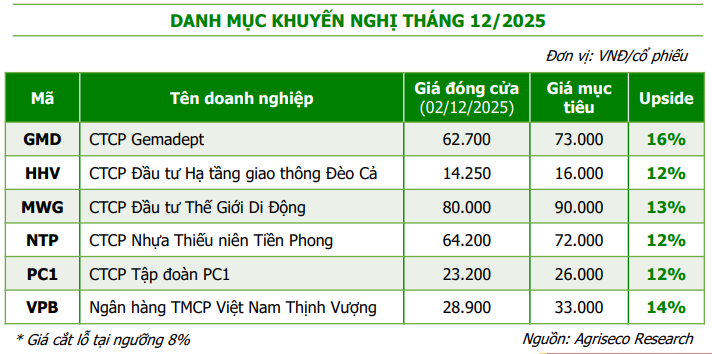 Với những phân tích trên, danh mục cổ phiếu khuyến nghị của Agriseco trong tháng 12/2025 gồm GMD, HHV, MWG, NTP, PC1 và VPB, là lựa chọn tiềm năng cho các nhà đầu tư tìm kiếm cơ hội tăng trưởng trong bối cảnh thị trường kiểm định mặt bằng giá mới và hưởng lợi từ các chính sách hỗ trợ vĩ mô.
