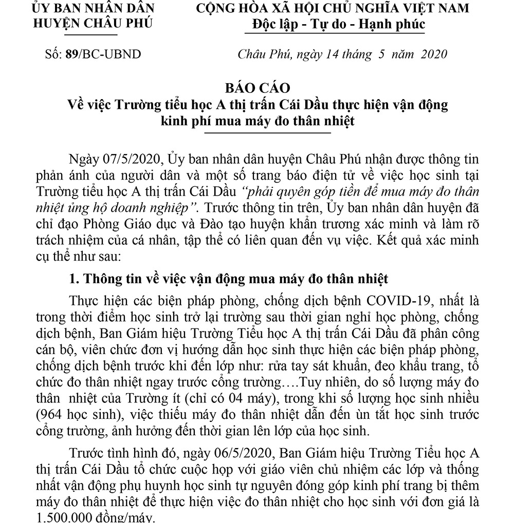 Do đó, sau khi nắm được thông tin, Ủy ban nhân dân huyện Châu Phú đã chỉ đạo Phòng Giáo dục và Đào tạo huyện Châu Phú, yêu cầu Ban Giám hiệu Trường Tiểu học A thị trấn Cái Dầu dừng ngay việc vận động tiền của học sinh và phụ huynh để mua máy đo thân nhiệt cầm tay; yêu cầu nhà trường phải xin lỗi và hoàn trả lại số tiền đã vận động được cho các phụ huynh học sinh. Đồng thời, tiến hành xem xét, kiểm điểm đối với những tập thể, cá nhân có liên quan.