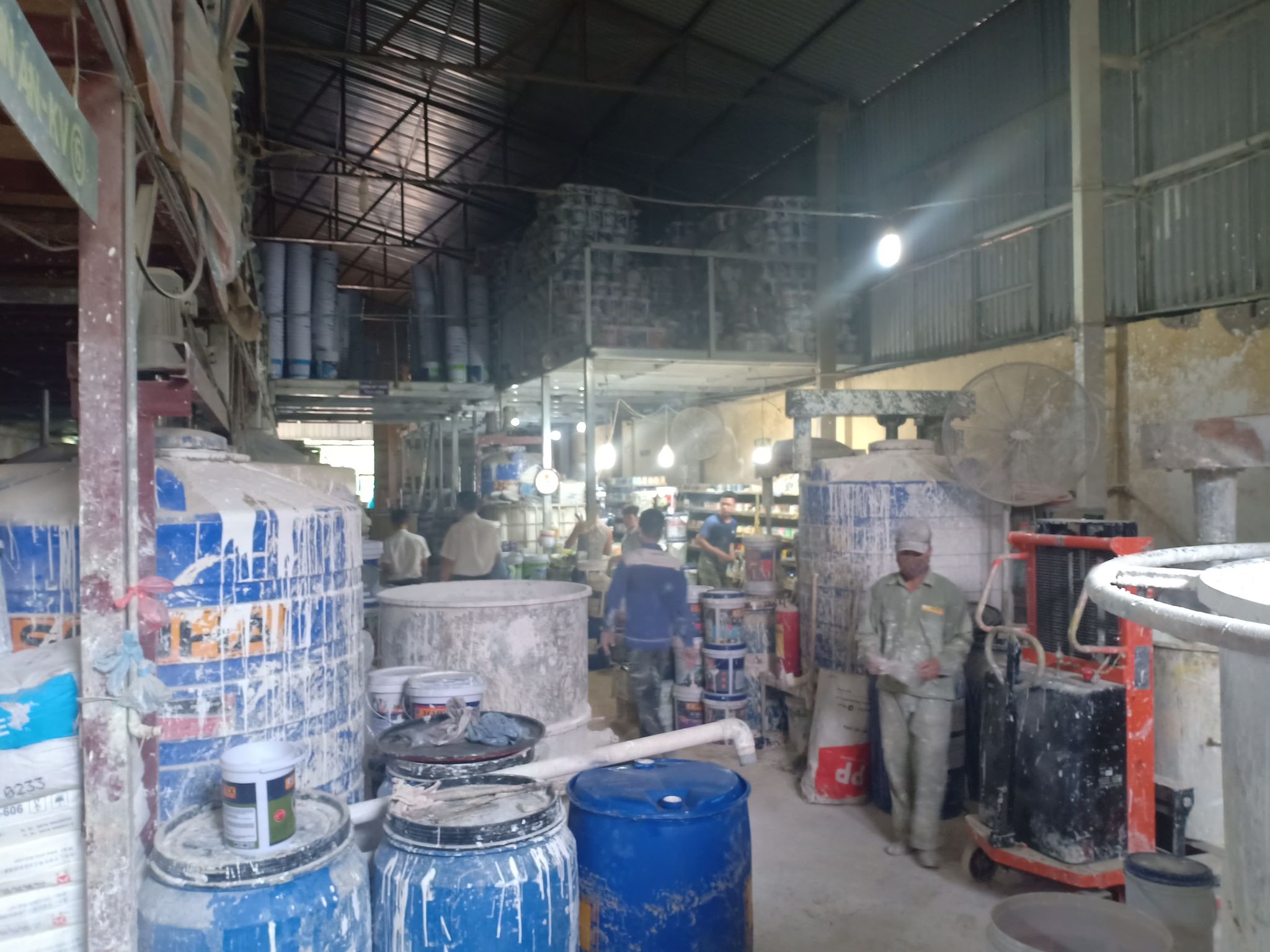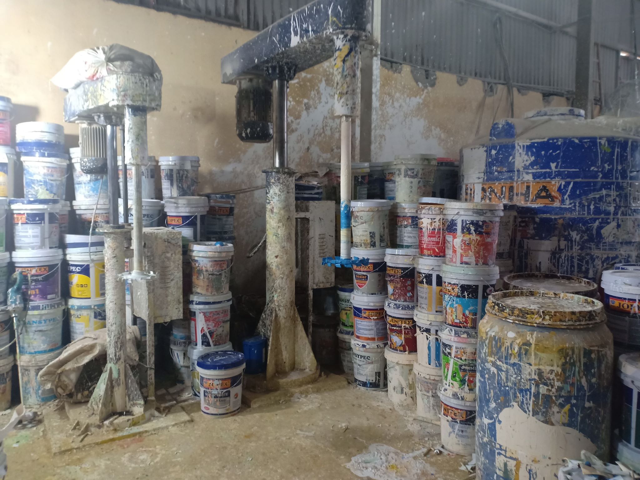 | Cơ sở sản xuất này được thiết kế kiên cố theo lối nhà xưởng, cửa sắt, bên trong có rất nhiều thùng sơn với nhiều nhãn hiệu khác nhau. |