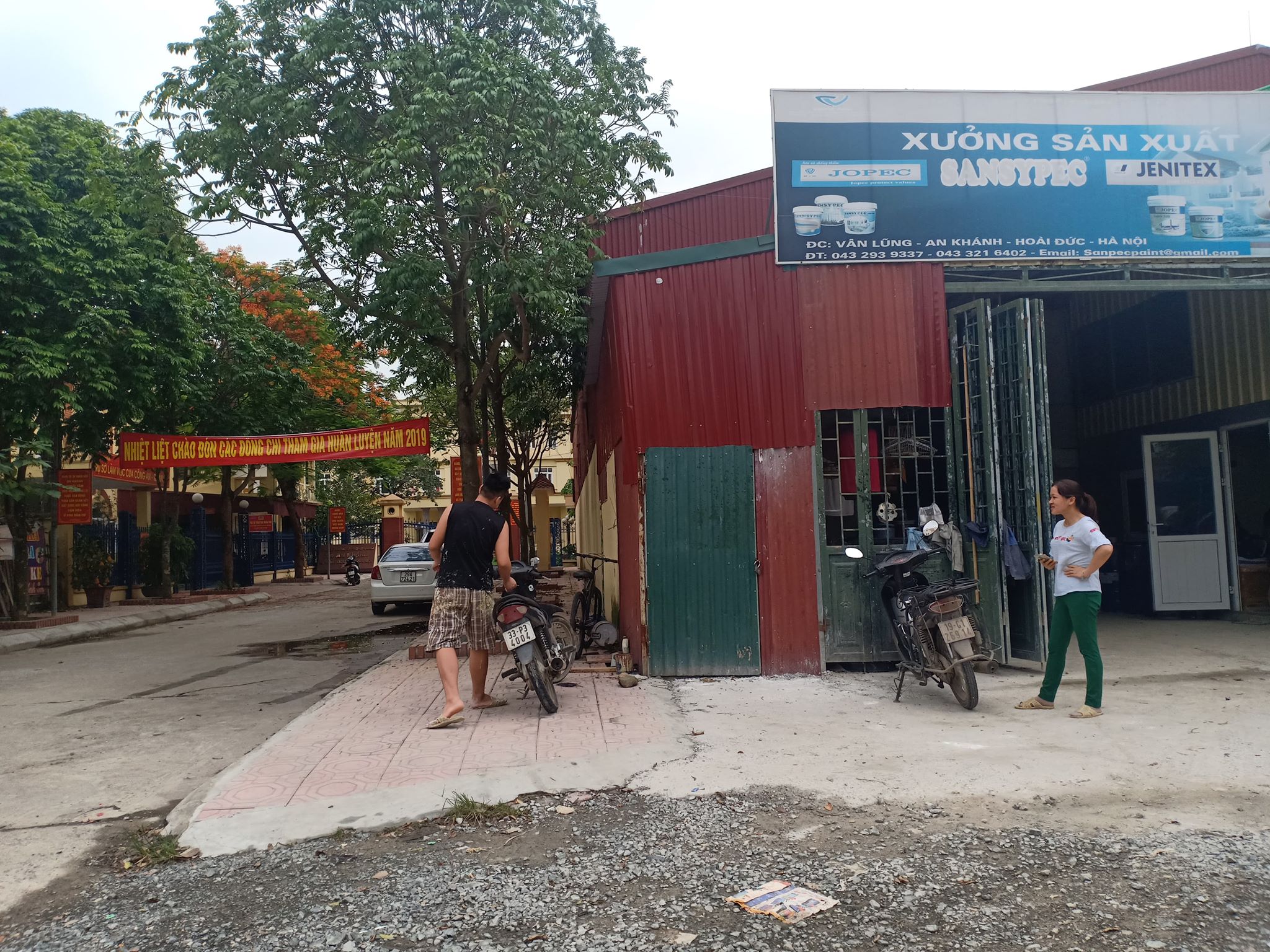 Có mặt tại thôn Vân Lũng chiều dịp cuối tháng 5, đầu tháng 6, theo quan sát của chúng tôi, xưởng sơn này nằm ngay sát trụ sở UBND xã An Khánh, rộng hàng trăm mét vuông. Không những vậy, xưởng sản xuất sơn Sanpec chỉ cách khu dân cư vài trăm mét, cách trụ sở làm việc của UBND xã An Khánh chỉ… đúng một bức tường, trong khi khu vực bên trong công nhân vẫn hoạt động pha chế bình thường. Cơ sở sản xuất sơn này được thiết kế kiên cố theo lối nhà xưởng, cửa sắt, bên trong có rất nhiều thùng sơn với nhiều nhãn hiệu khác nhau, bên ngoài có nhiều thùng phuy nhựa đựng hóa chất. |