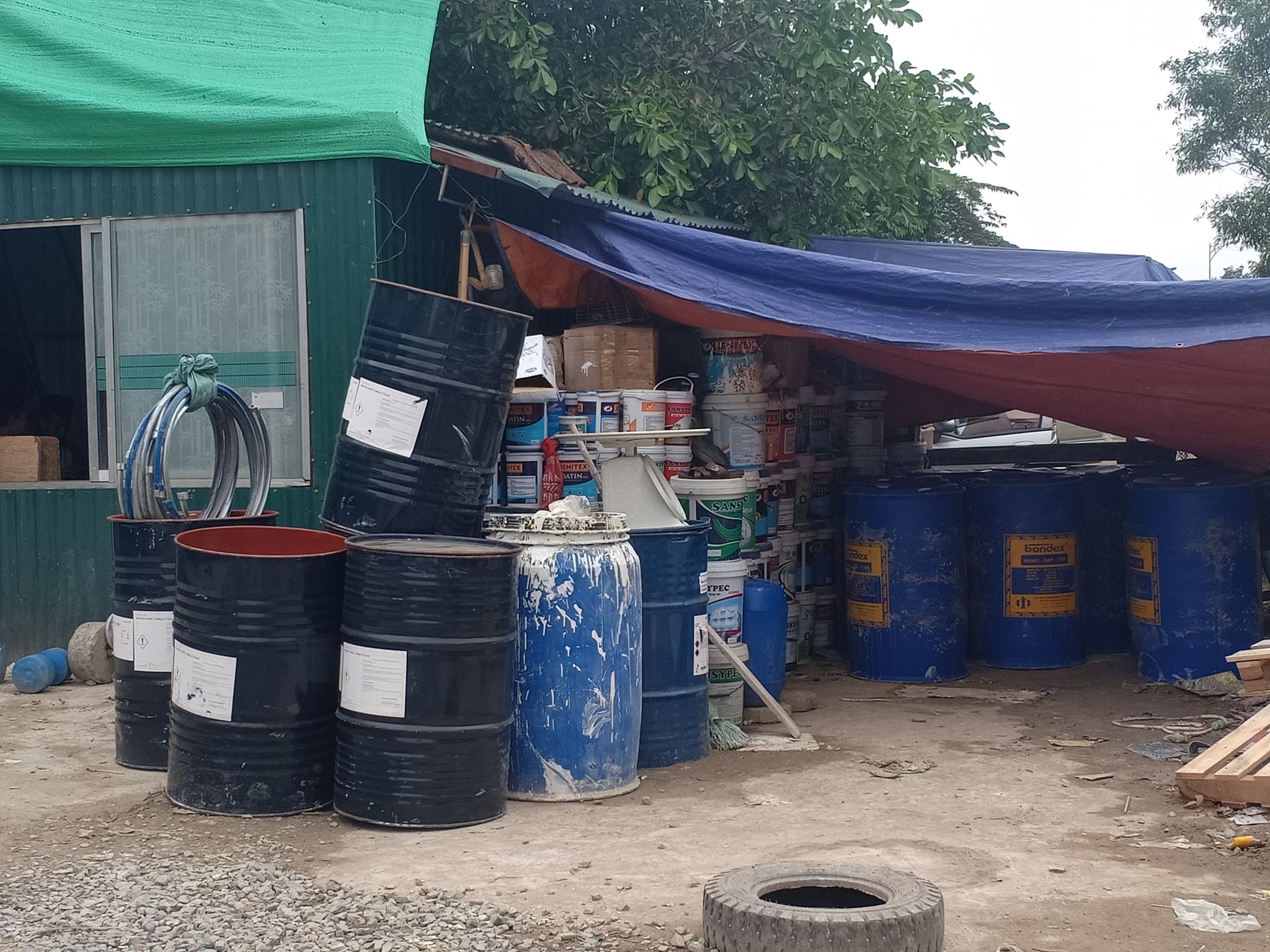 Bên ngoài xưởng có nhiều thùng phuy nhựa đựng hóa chất