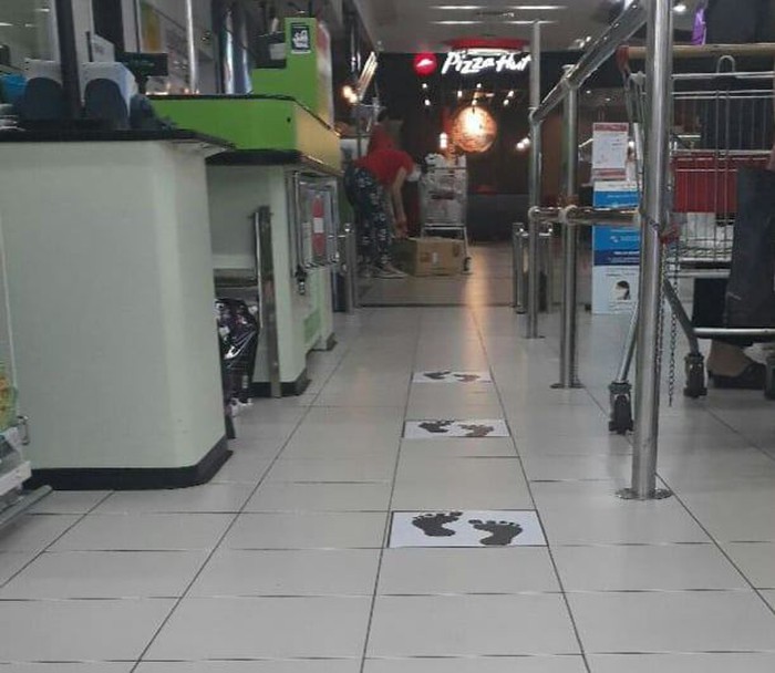 Siêu thị đánh dấu khoảng cách bằng bước chân để khách hàng xếp hàng cho dễ dàng, thuận lợi