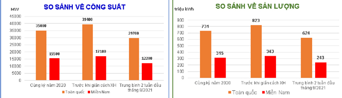 Trung bình ngày trong 2 tuần đầu tháng 9, riêng khu vực miền Nam mức công suất đỉnh của toàn miền Nam là gần 12.200MW, sản lượng toàn hệ thống điện miền Nam là 243 triệu kWh/ngày. Căn cứ với số liệu thống kê thì mức tiêu thụ điện toàn miền Nam trong 2 tuần đầu tháng 9 vừa qua đã thấp hơn tới 29% so với trước khi bắt đầu thực hiện giãn cách xã hội từ giữa tháng 7; đồng thời cũng thấp hơn 23% so với cùng kỳ năm 2020.