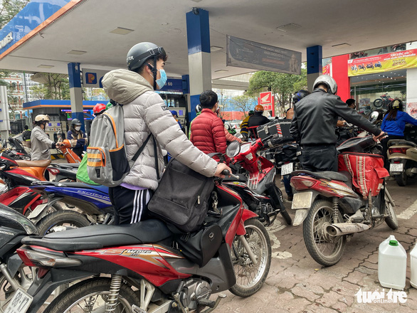 Nhiều người dân mang thêm can để mua xăng. Ảnh: Tuổi trẻ.