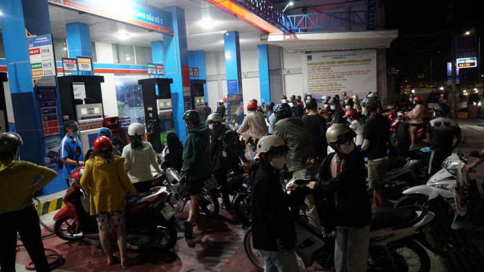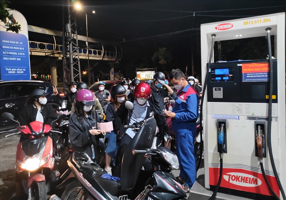 Hàng chục xe máy nối đuôi không theo hàng lối đến đổ xăng tại cây xăng ở đường Nguyễn Văn Linh (Đà Nẵng). Ảnh: Plo.